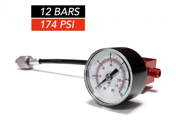 Le manomètre analogique BIMPAIR doublement gradué bar/psi offre la possibilité de se connecter à la Capsule BIMPAIR pour une précision de réglage pression ou une détection de fuites.Son embout spécial amortisseur empêche la perte d’air ou d’azote lors du dévissage.Fourni également avec une aiguille pour le rendre compatible aux diverses connexions souhaitées.Lecture jusqu’à 12 bars/174psi.