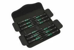 Tournevis Wera Micro en assortiment, pour vissages en mécanique de précision. La crête pivotante servant d’appui à la main et la zone de rotation rapide située juste en-dessous permettent un > très rapide. Le repositionnement fastidieux de la main n’a plus lieu d’être. Rangement et transport dans un robuste étui portable à la ceinture, permettant d’avoir toujours les outils à portée de main.
